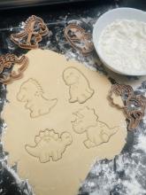 Dino koekjesvormen Deze set bevat 4 verschillende dino vormen van +/- 8 cm groot. Inclusief koekjesrecept Koekjes maken samen met de kindjes ♡ Om daarna mooi in te pakken en als geschenkje af te geven. Ook leuk om te gebruiken in combinatie met : - zoutdeeg om achteraf samen te verven - plasticine - kinetisch zand