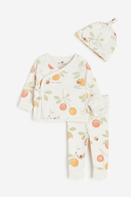 Cradle to Cradle Certified® Gold. Een top, een legging en een beanie van superzacht katoentricot. De top heeft een overslag vooraan met striklintjes opzij, een geribd biesje bij de hals en aan de onde...