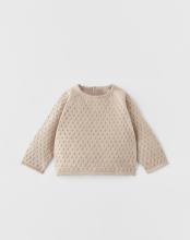 Tricot trui met ronde hals en lange mouwen. Knoopsluiting achter.