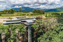 Vanaf hier kun je een glazen lift nemen waarmee je vanaf een plateau 51 meter diep afdaalt naar het tropisch regenwoud eronder.