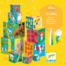 10 cubes en carton avec des animaux de la forêt. Empilez-les ou glissez-les pour découvrir des scènes de la vie quotidienne et créer une tour de cubes imagiers