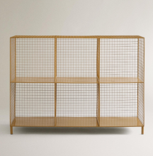 Metalen rek voor kinderen met twee planken en zes vakken. Met metallic gaasstof aan één kant.